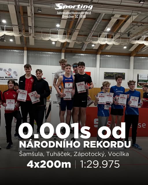 Dorostenecká štafeta na 4 x 200m ve složení František ŠAMŠULA, Jan TUHÁČEK, Adam ZÁPOTOCKÝ a Vojtěch VOCÍLKA dnes v Drážďanech zaběhla druhý nejrychlejší čas v historii české atletiky. Od vyrovnání národního rekordu je dělila pouhá jedna tisícina sekundy. Pro kluky je to obrovská škoda, ale zároveň skvělý ukazatel pro tuto štafetu do budoucna.